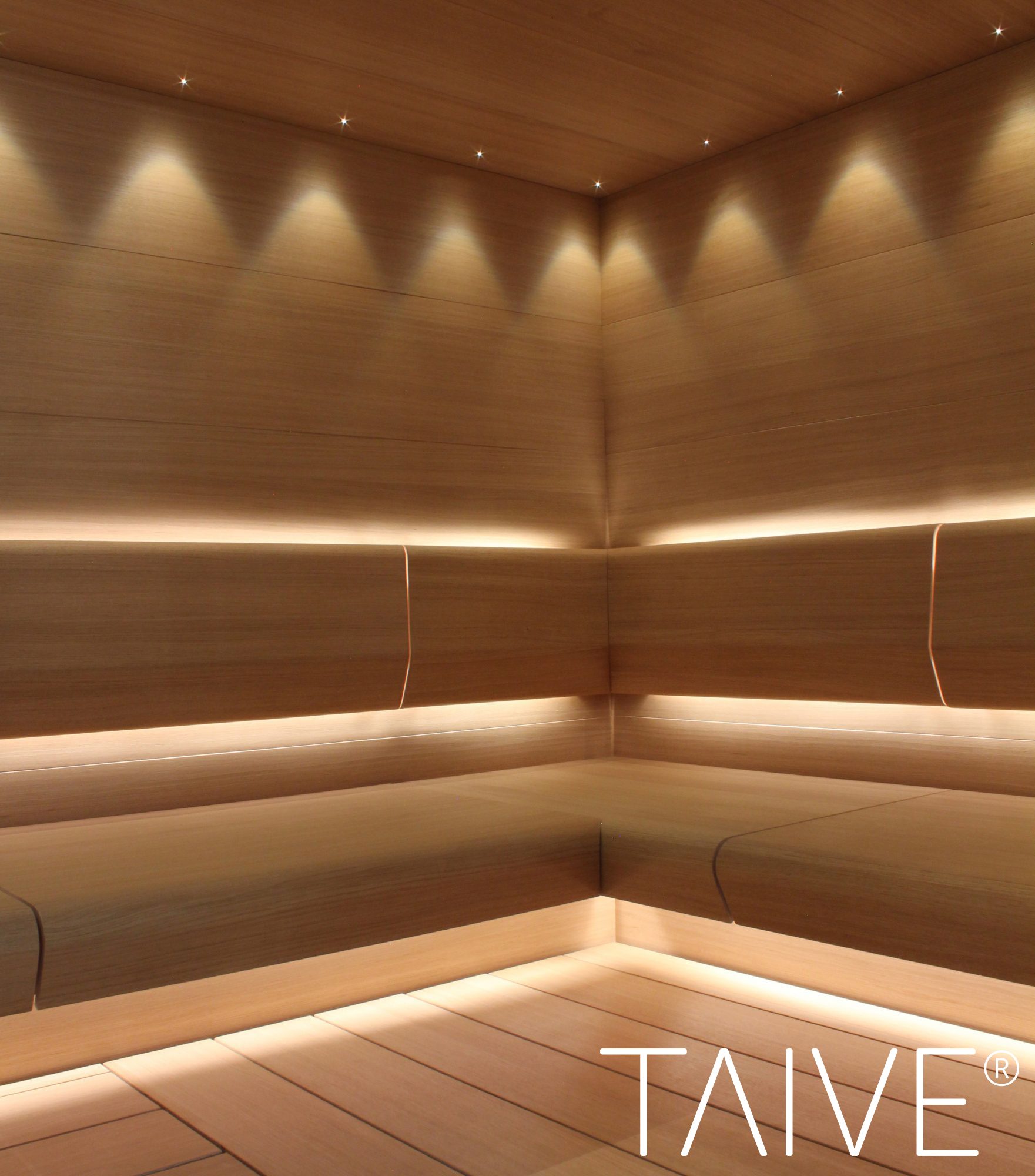 Cariitin Taive sauna linear valaistuksella lauteilla, kuidut katossa, valaistut mittarit.