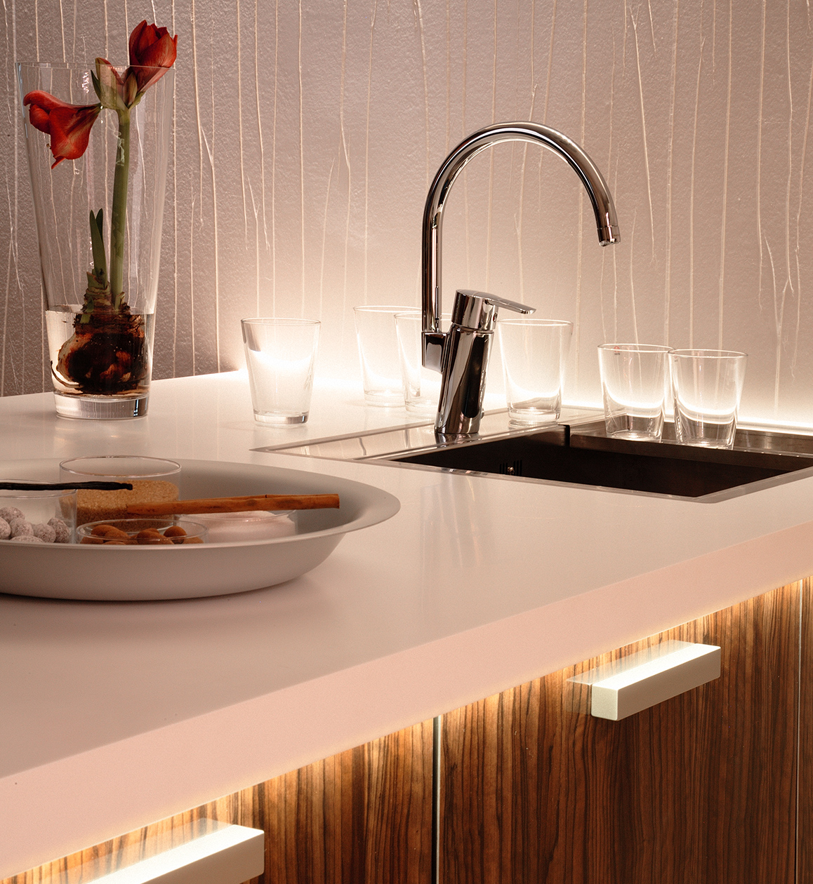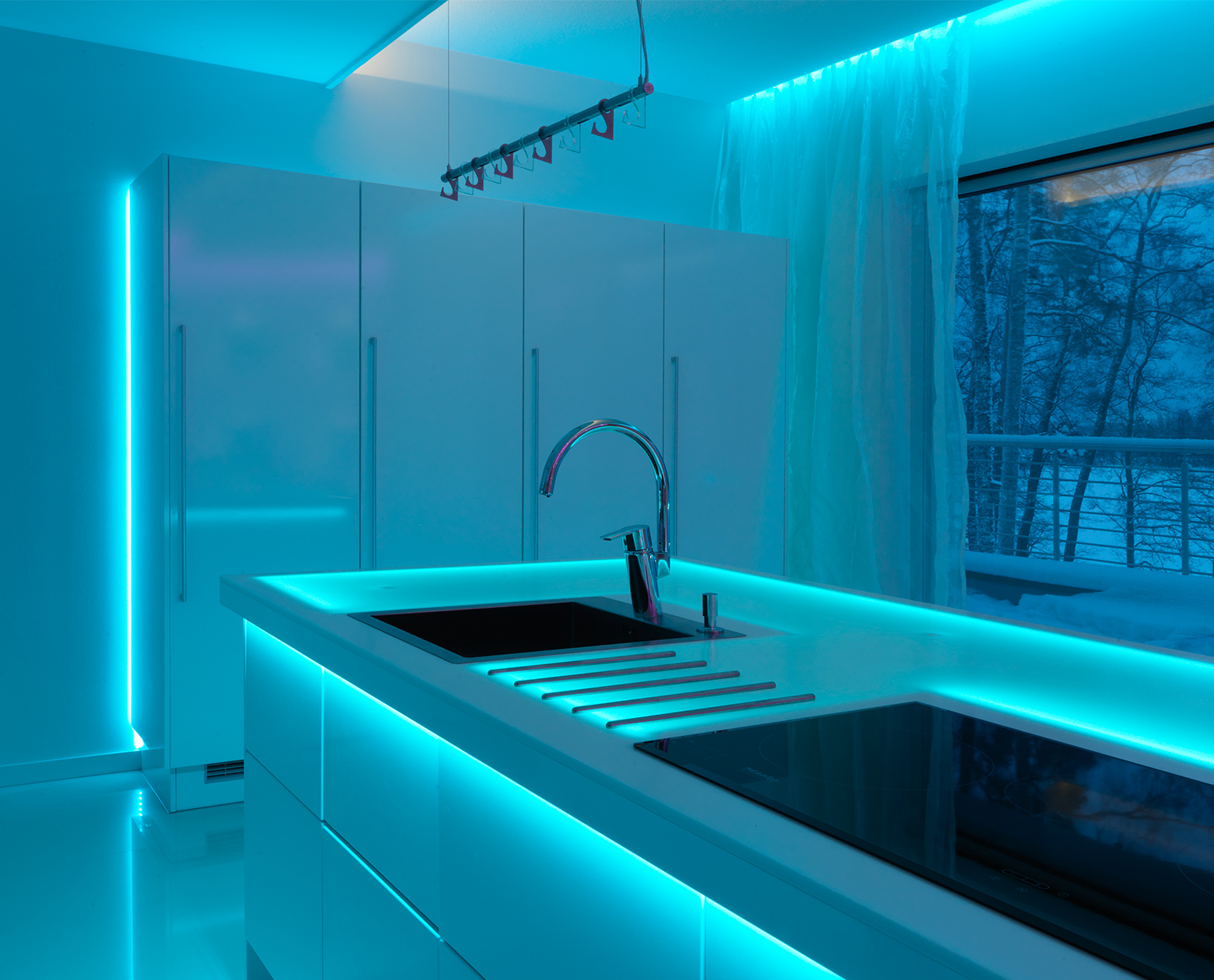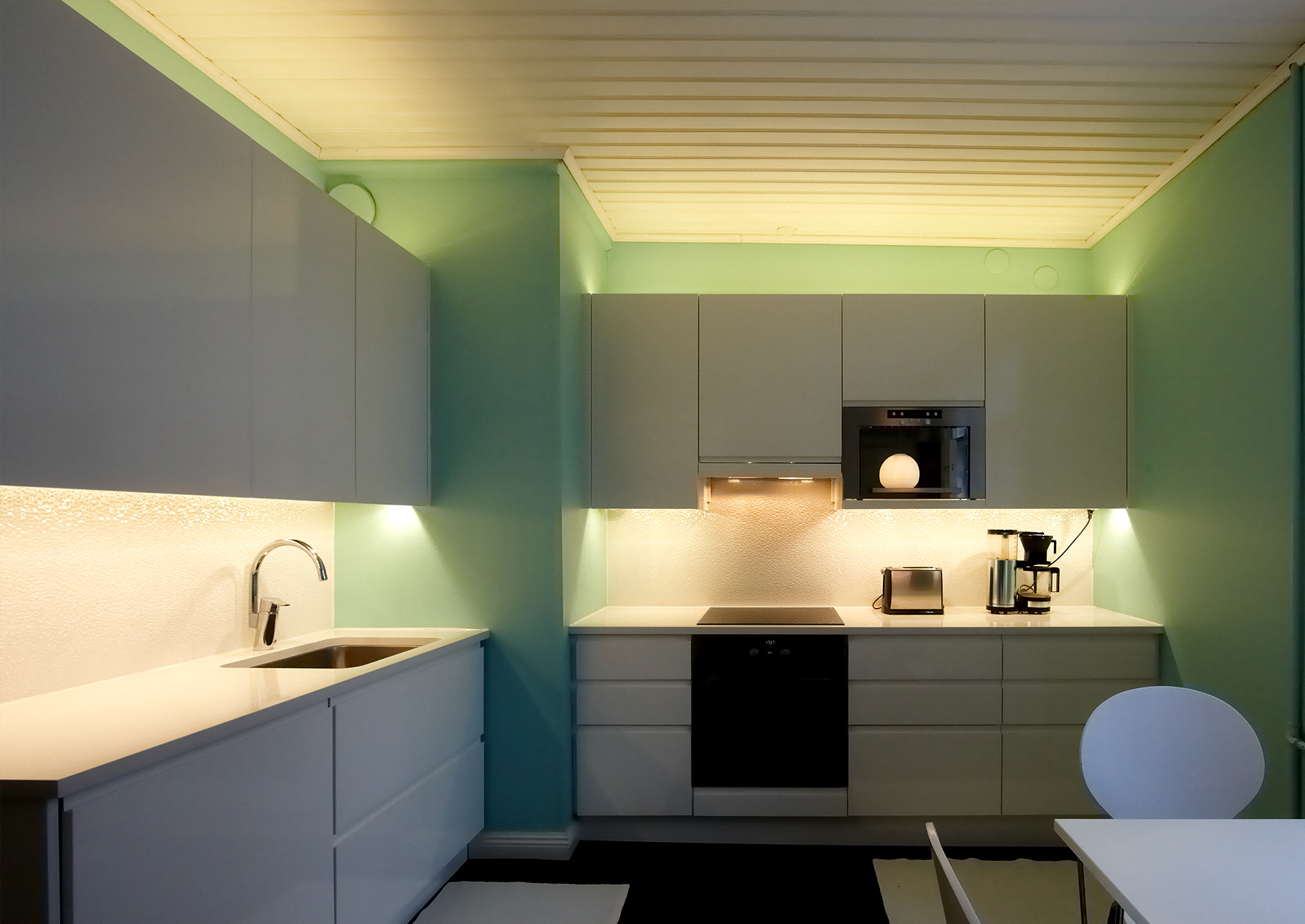 Светильники Huuhto можно устанавливать под краем столешницы, при этом они освещают вертикальную поверхность шкафов.