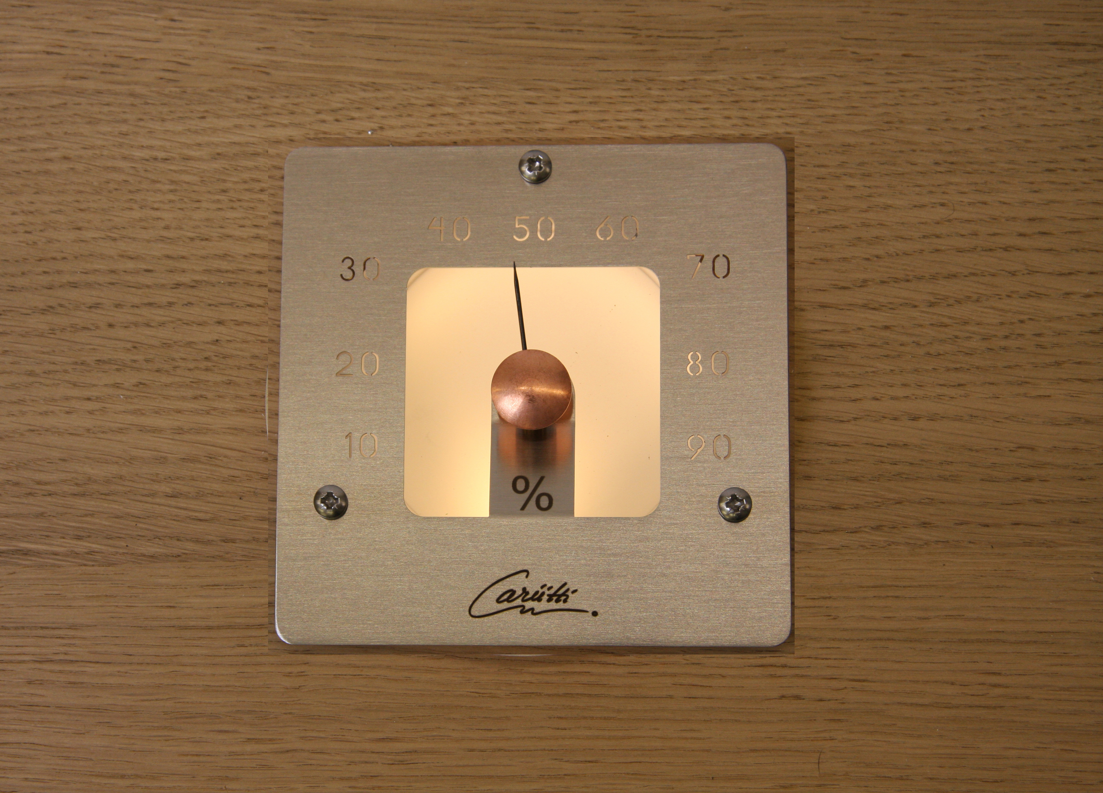 Размер термометра 120 х 120 мм, глубина ниши для установки 40 мм. Выступает над поверхностью обшивки на 20 мм. Крепится к стене тремя винтами из нержавеющей стали, входящими в комплект.