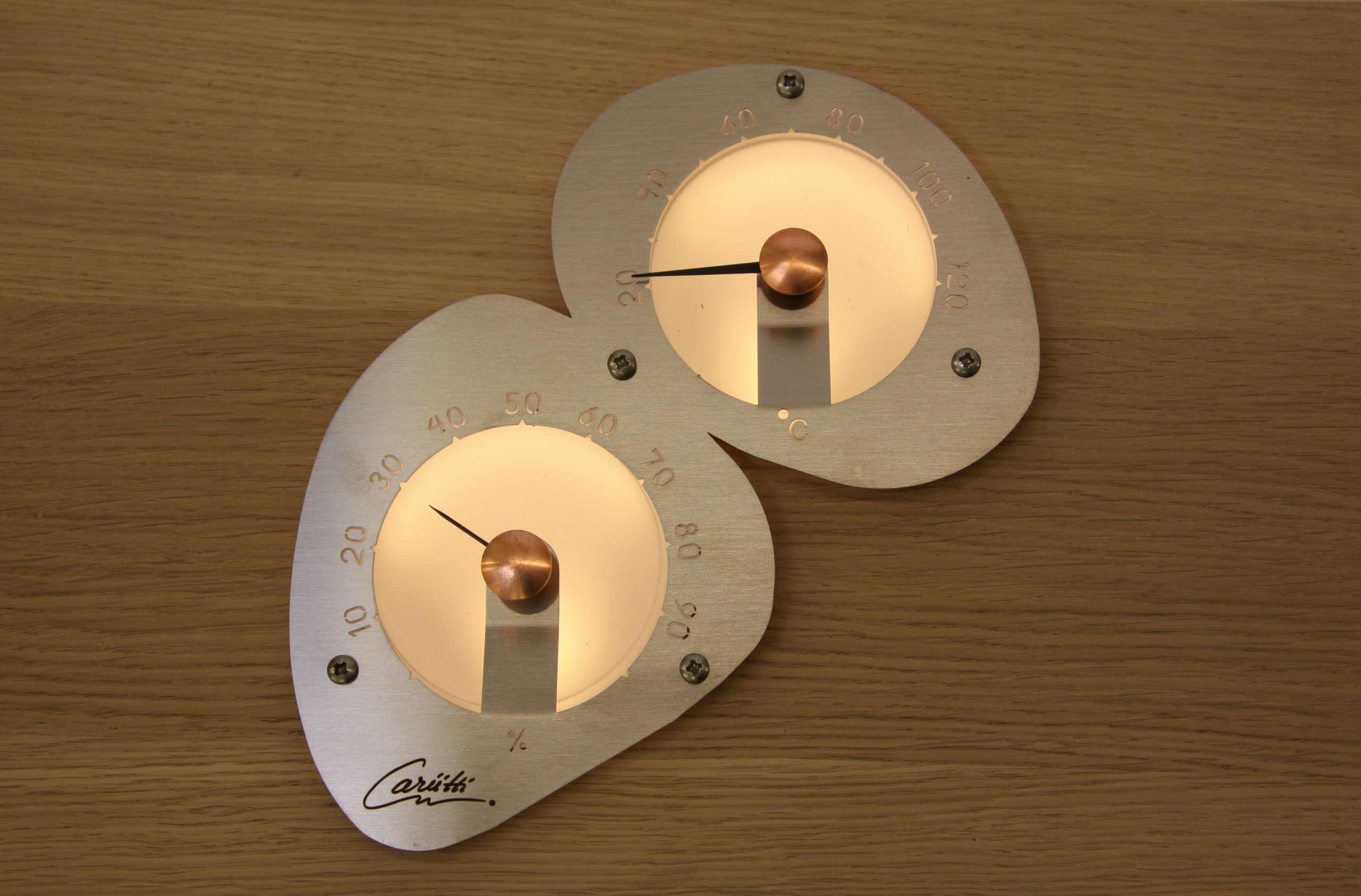 Kivi en kombinerad termometer och fuktmätare för bastu. Kivi formgivning härmar starandstenarnas form. Mätaren är tillverkad av satinglasmassa med slipad rfs-gradering och den är belyst med två led eller två 2-4 mm fibrer.