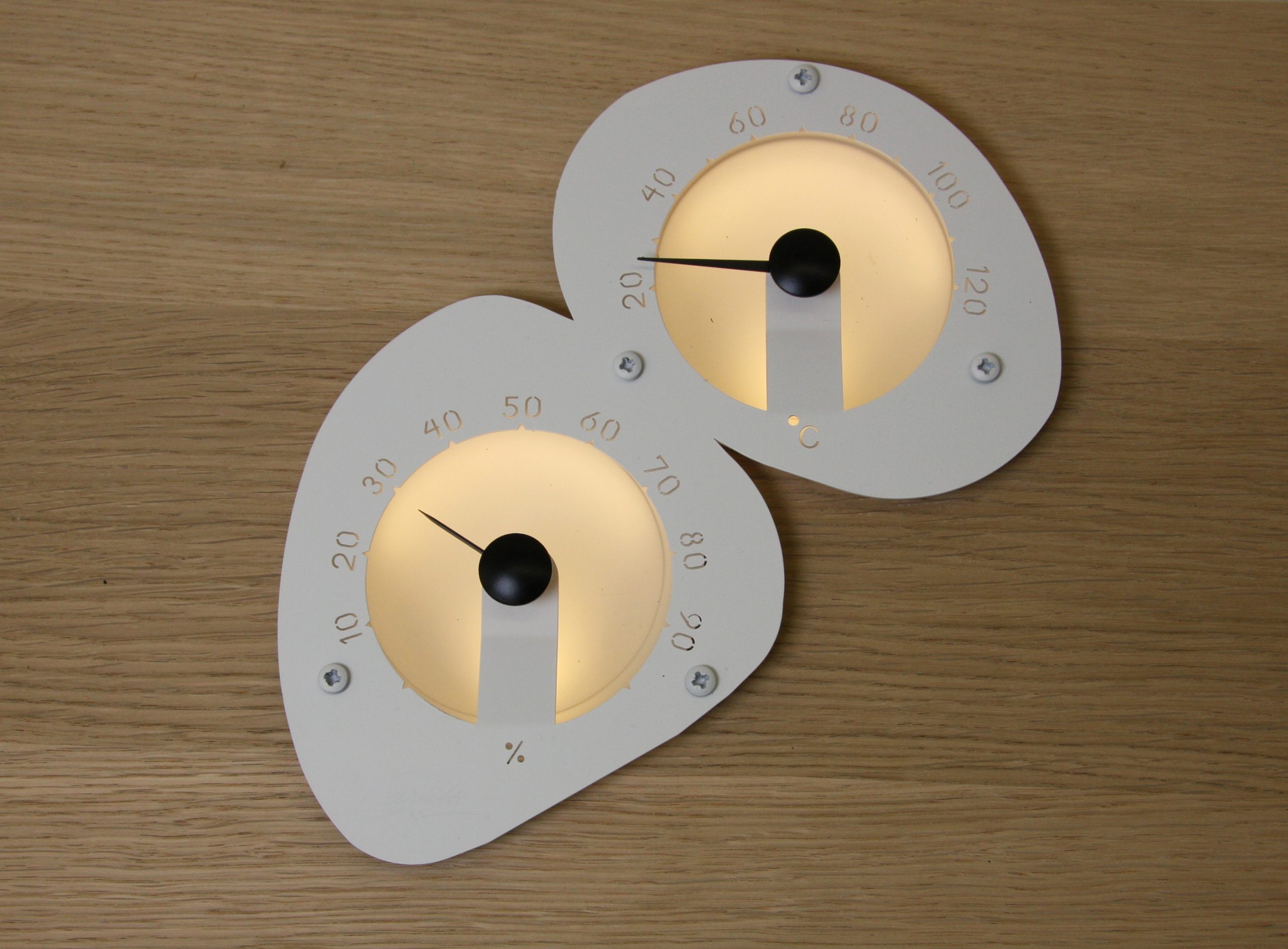 KIVI är en kombinerad temperatur och fukt termometer avsedd för bastu. Kivis former påminner om strand stenar . Metaren är tillverkad av satinmassa glas och rfs-mätskala och den belyses med två st. led elle rmed 2-4 mm ljusfiber. Vit.