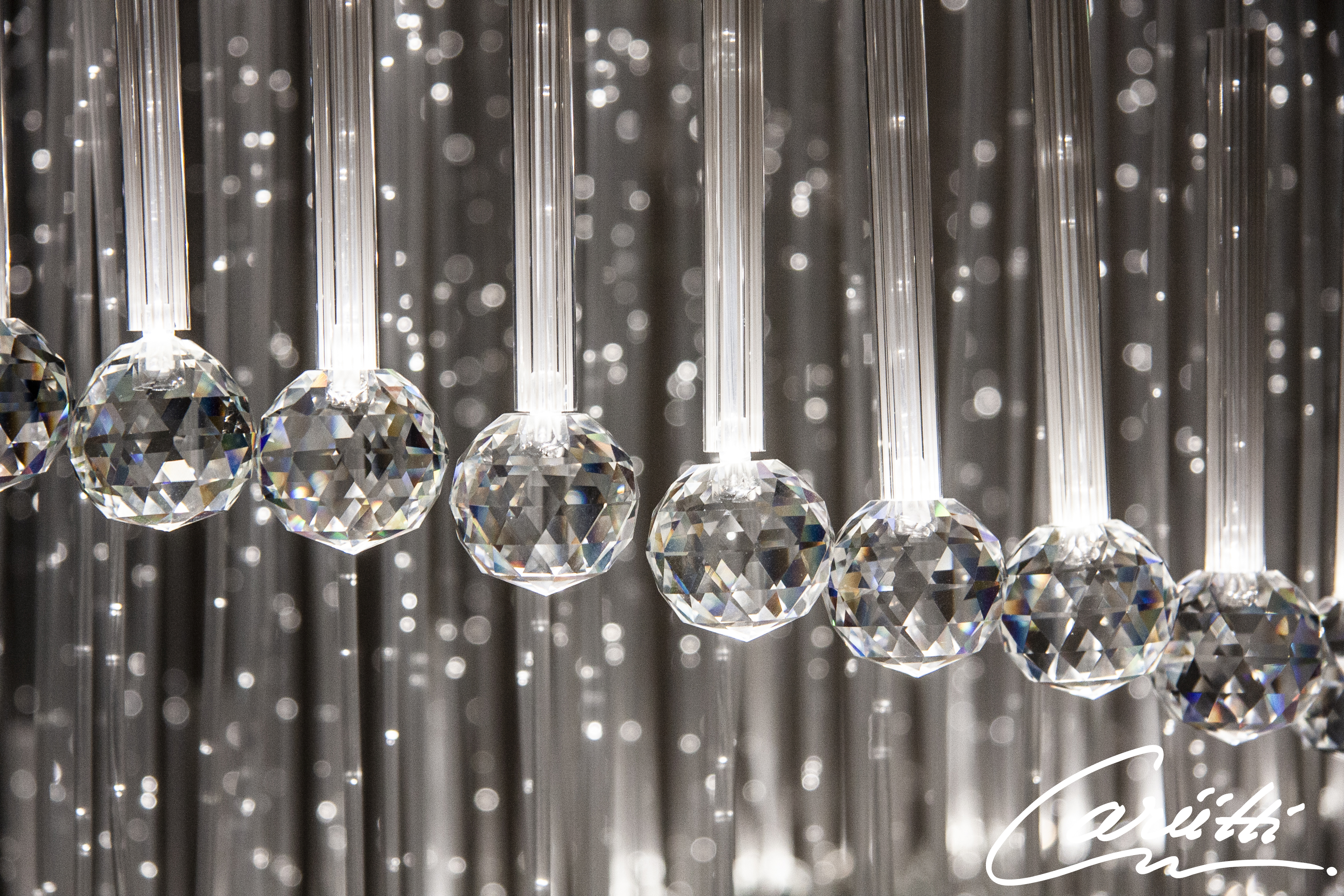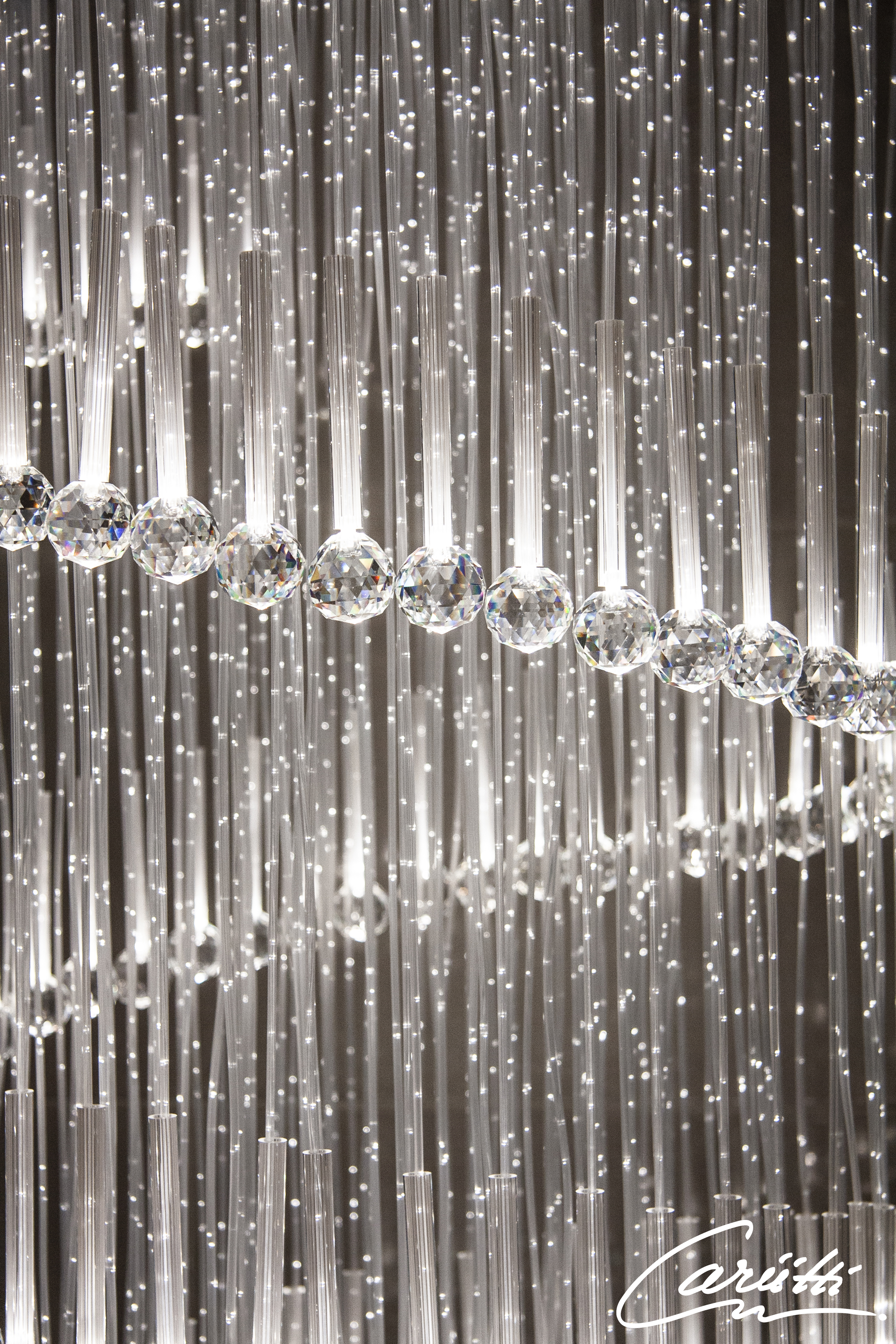 Valokuitukruunu on asennusvalmis kokonaisuus, jossa kuidut on asennettu valaisinrunkoon ja kristallit kuitujen päihin.