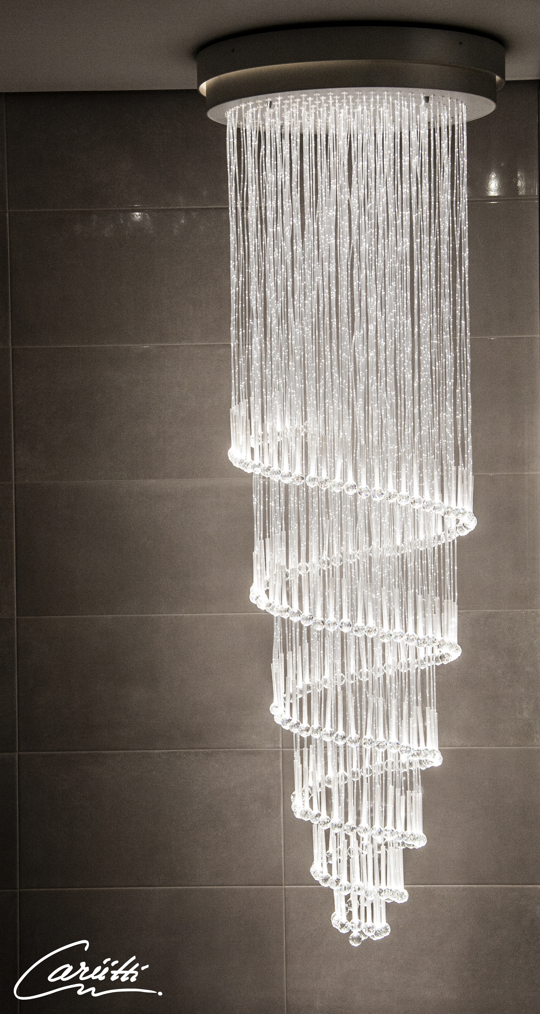 Spiraalinmuotoinen valokuitukruunu, jossa valonlähteenä led-projektorit. Korkeus 180 cm ja halkaisija 56 cm.