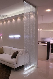 Pirta Flat -valokuituverho on asennusvalmis kokonaisuus, jossa kuidut on asennettu valaisinrunkoon ja kristallit kuitujen päihin.